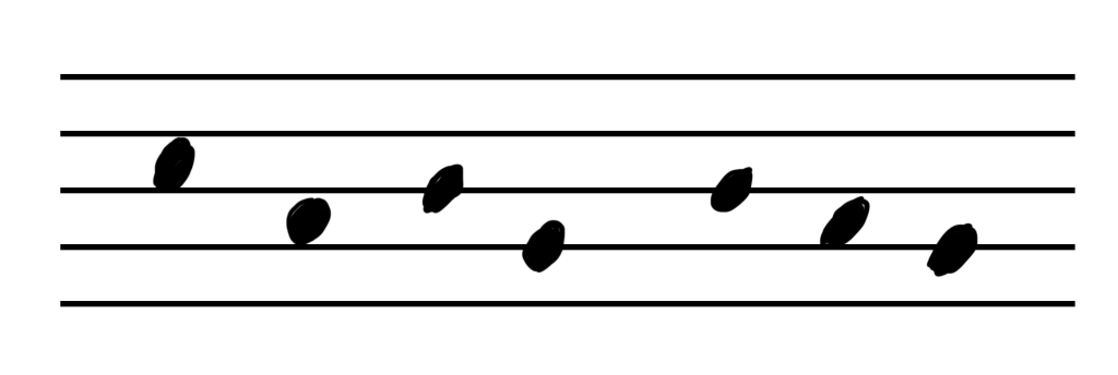 Even if you can’t read music, you can see that the notes are close together and they generally are descending in motion. Look at the red line. We’ll call that the melodic line: