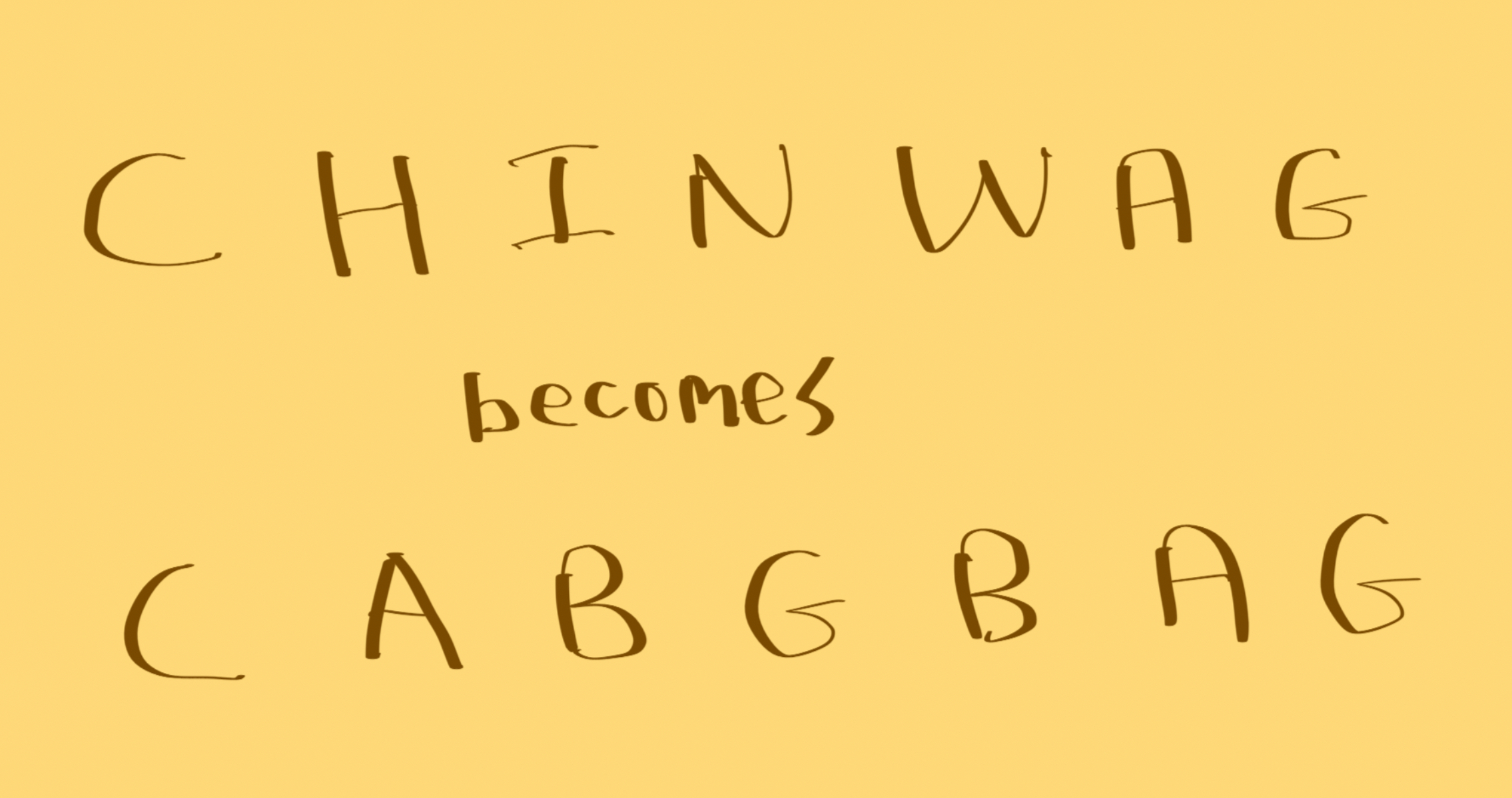 Here is an example of turning a word into a musical word. We will spell the word CHINWAG and then turn that into a musical CHINWAG or CABGBAG (only musical letters). In the word CHINWAG there are three musical letters- the C, A and G. The non-musical letters are, H, I, N and W. We’ll take the non-musical letters from rows 2, 3 or 4 in our musical cryptogram and turn them into a musical letter corresponding above to row 1, the musical alphabet, in that same column. For example, the first non-musical letter in CHINWAG is H, which is in column one of the musical cryptogram. When you go up to the music alphabet from row 2, where H is, the musical letter for H will be A. So here is what happens with the word CHINWAG: