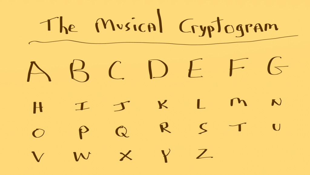 But before we begin, let’s see what a musical cryptogram is. For our composition we’ll use a system where non-musical letters are turned into musical letters. We can then use those musical letters as a point of departure for our melody. Here is our musical cryptogram.