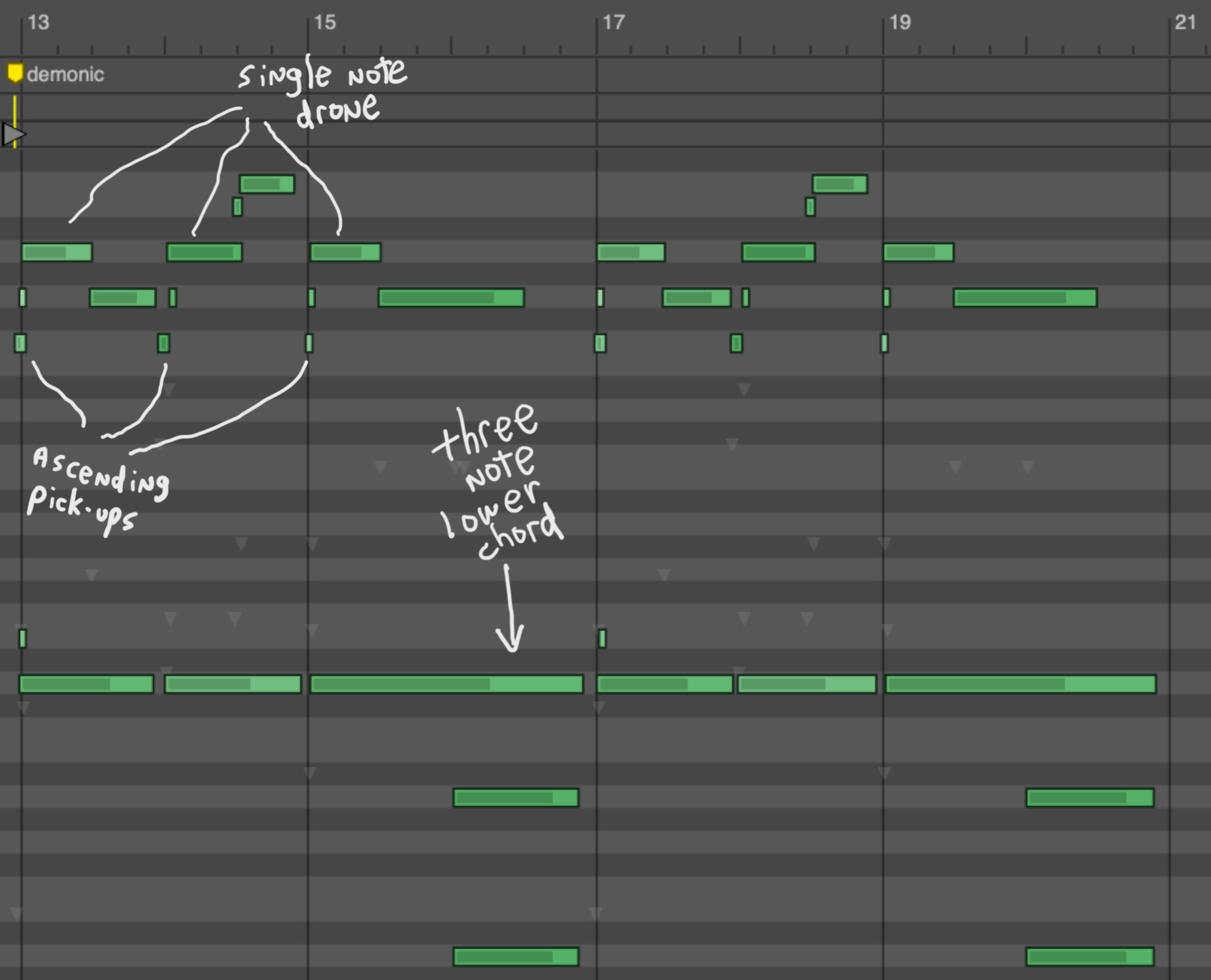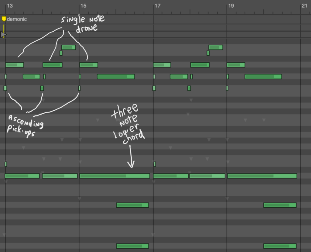 After hearing those pitches and playing them at the same tempo as the first word, chinwag, they sounded bright and were ascending up, which made it even brighter. I thought, “Is this what demonic should sound like?” Of course it should.