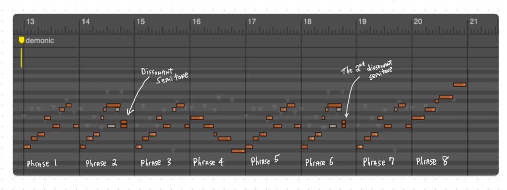 As you can hear, I threw in a couple of dissonant, demonic moments to add to the consonant, ascending line. In western music history there was an interval called the devil’s interval or in latin, diabolus in musica. The interval is called a “tritone” because it is made up of three whole tones. For more on this sound go here. But the devil’s interval is not the only place in music where dissonance can be found. I’m using two harmonic intervals that are both called a semitone or a minor second or a half step. A harmonic interval is when two pitches are played simultaneously. Two notes being only a half step apart are as close as two pitches can be that aren’t microtonal.