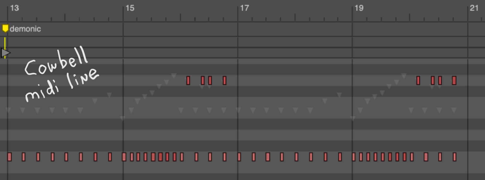 The cowbell is continuing a mostly steady quarter note pulse with a couple of eighth notes thrown in. It is a fun instrument to play. Here is what the midi line looks like.