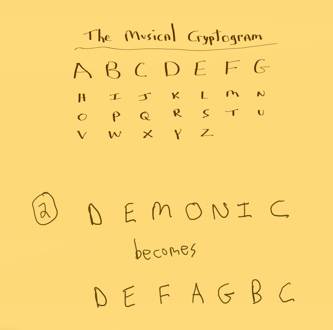 Here is what the musical cryptogram looks like for the word demonic.