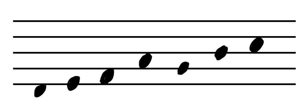 We explored the word “chinwag” on post two using our musical cryptogram. In this installment we worked with the word “demonic” sent in by our good friend Garry Eister, composer of extraordinary music, many featuring the guitar. Thank you Garry.